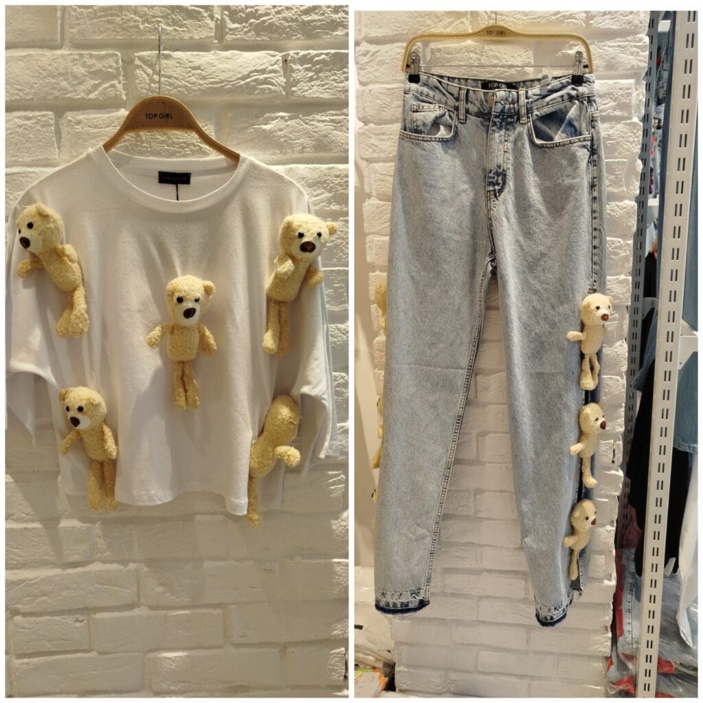 👖 High-Waisted Denim Jeans – Light-wash, classic-cut jeans featuring teddy bears stitched along one side, creating a charming, asymmetrical detail.